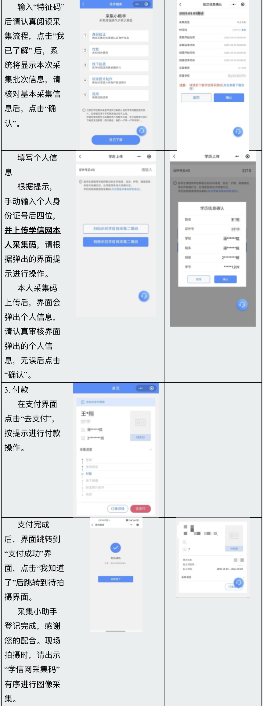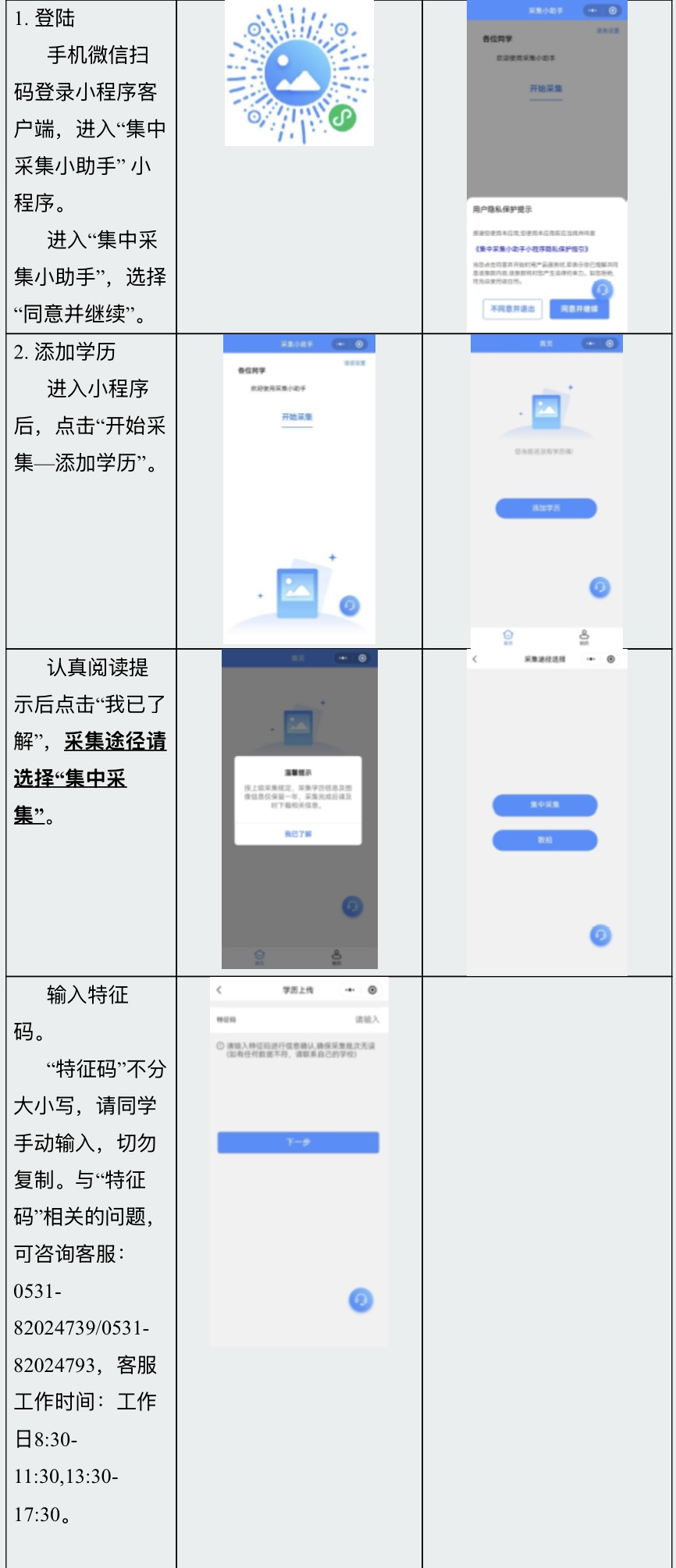 毕业生图像信息采集线上缴费“集中采集小助手”操作说明 (2025年10月19日,2026届补采集特征码:U5T92D) “集中采集小助手”小程序用于线上缴费。操作步骤:登录→添加学历,确认所在采集批次→填写及确认个人信息→付款→结束操作。 注:若有问题可咨询在线客服或致电:0531-82024739/0531-82024793,客服工作时间:工作日8:30-11:30,13:30-17:30。