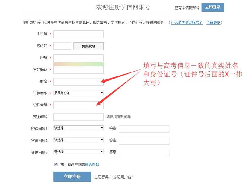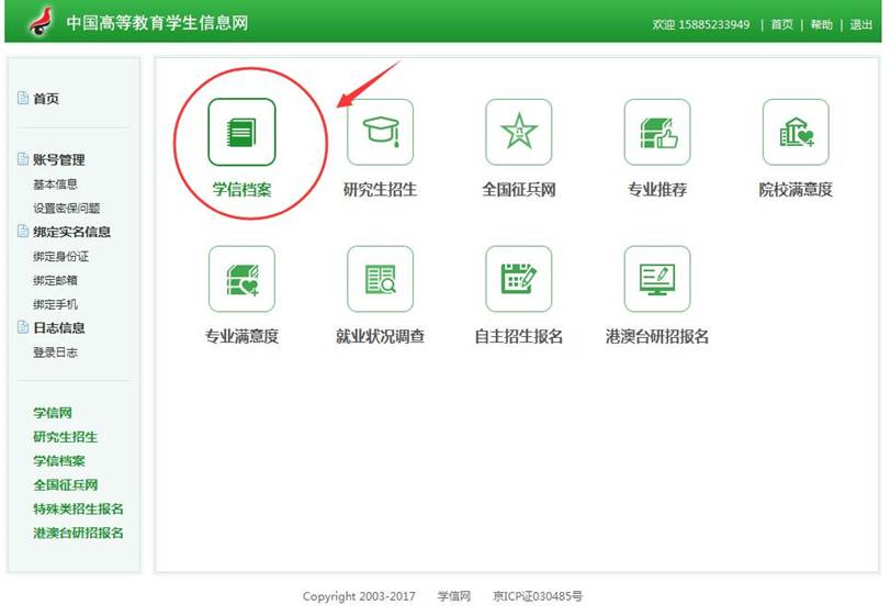 新生学信网学籍查询方法 打开中国高等教育学生信息网(网址:http://www.chsi.com.cn/) 一、选择“学籍查询”或“学信档案”。 二、进入“学信档案”页面,选择“注册学信帐号”,已注册过的直接登录。 三、注册 注意: 1.请牢记本人的用户名(一般为手机号)、密码和邮箱,以便随时查询学籍 信息及毕业学历信息。 2.因学校没有对学生用户的管理权限,如忘记用户名或密码,请按网上提 示的操作方式找回用户名和密码。 四、注册成功后,出现如下页面: 五、登录 登录成功后 点击“学信档案”查询学籍