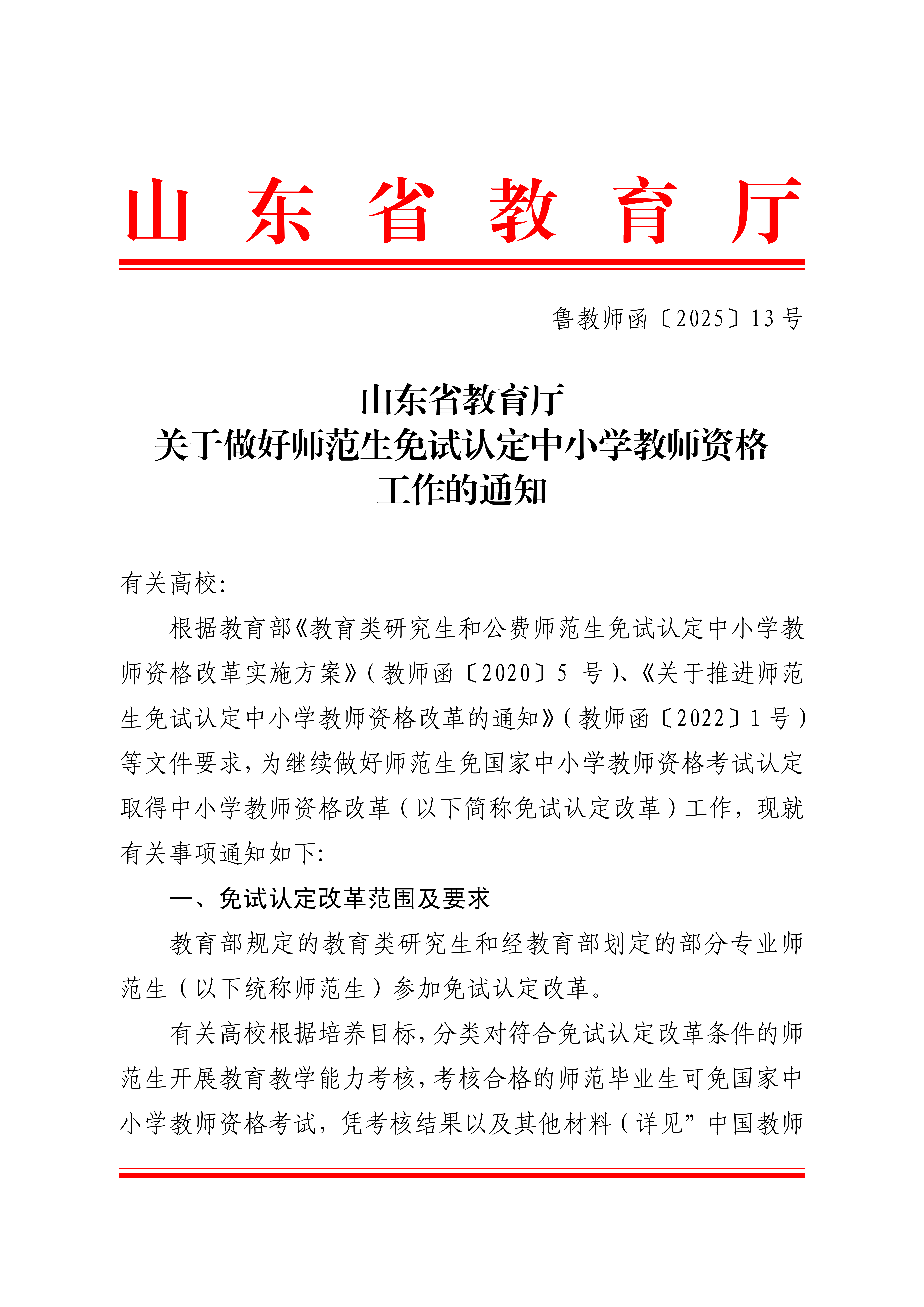 - 鲁教师函〔2025〕13号 山东省教育厅2025年免试认定的通知