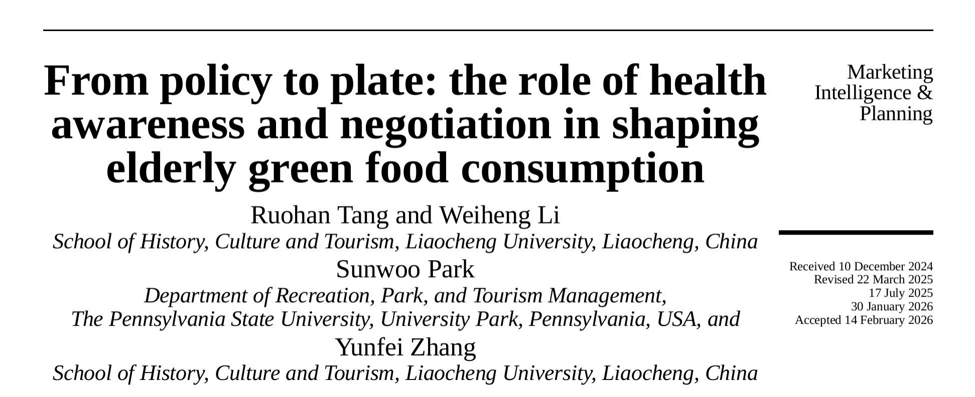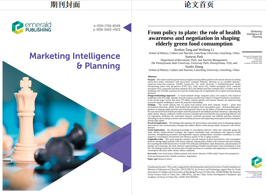 近日,我院教师唐若菡团队在食品消费与老龄健康研究领域取得新进展,相关研究成果以《From Policy to Plate: The Role of Health Awareness and Negotiation in Shaping Elderly Green Food Consumption》为题,正式发表于国际知名学术期刊 Marketing Intelligence & Planning。该成果由我院教师唐若菡博士、张云飞博士、美国宾夕法尼亚州立大学Sunwoo Park博士,以及旅游管理专业本科生李炜恒共同完成,是科研与人才培养深度融合方面取得的又一重要成果。 Marketing Intelligence & Planning由Emerald Publishing出版,是国际营销与商业管理领域具有重要影响力的SSCI收录期刊,最新影响因子为5.4,位于JCR Q1分区。该刊长期聚焦消费者行为、市场战略、营销智能、数字化转型与可持续消费等前沿议题,致力于推动营销理论创新与管理实践的融合发展,研究成果在国际学术界享有良好声誉。 本研究将国际宏观绿色食品政策导向与微观消费行为相联结,基于拓展的刺激—机体—干预—响应(SOIR)框架,考察全球慢性病老年患者的绿色食品消费行为,检验健康意识的中介作用与协商能力的调节作用。研究采用混合研究方法,对绿色食品政策文件进行语义网络分析,并通过结构方程模型分析中国慢性病老年患者的调研数据。结果表明,绿色食品政策所归纳的主题聚类在塑造供给优先级、引导老年食品选择中发挥着指引作用;健康意识在利益感知与购买意向之间发挥中介作用,将感知利益转化为实际购买行为;协商能力则负向调节约束感知与习惯性购买意向之间的关系,能够缓解经济与可及性压力。研究成果为政策制定者与市场主体提供实践指导,有助于推动可持续食品消费,深化对老年健康导向型绿色食品消费的理解。 该研究体现了我院师生团队秉持国际视野、问题驱动、融合跨学科方法的科研理念,展现出高效的科研协作能力与突出的学术创新素养,彰显我院在银发经济研究领域的日益积淀与探索势能。未来,团队将持续围绕人口老龄化、健康消费、食品供需等重大现实议题深入开展纵深研究,致力产出更多具有国际影响力的高水平成果,为相关领域发展提供学术参考。