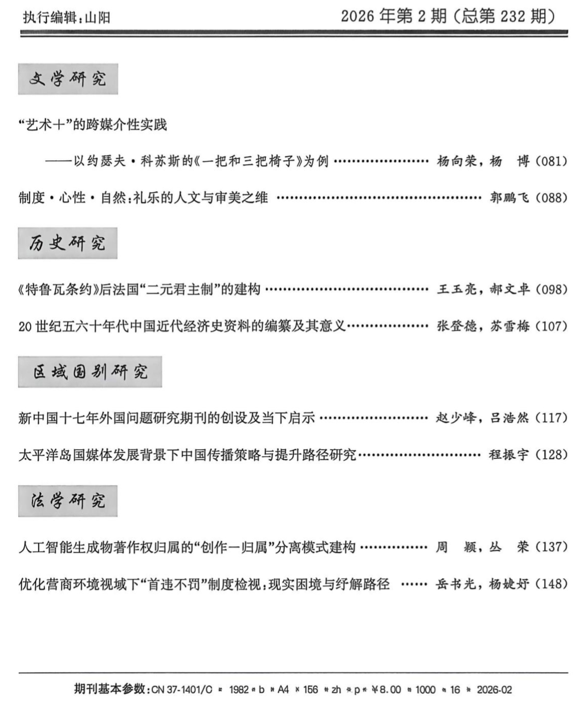 近日,《聊城大学学报(社会科学版)》2026年第2期正式出版,其“区域国别研究”专栏刊登了两篇由中心研究人员撰写的最新论文,分别是赵少峰教授与吕浩然合作完成的《新中国十七年外国问题研究期刊的创设及当下启示》,以及天津师范大学博士生、中心兼职研究人员程振宇撰写的《太平洋岛国媒体发展背景下中国传播策略与提升路径研究》。两篇文章分别从区域国别学期刊建设与国际传播研究视角出发,展现了中心在该领域的多元探索。 《新中国十七年外国问题研究期刊的创设及当下启示》一文,系统梳理了新中国成立初期外国问题研究相关期刊的创办与发展历程。文章指出,这些期刊的发展为区域国别研究奠定了重要文献基础,是新中国自主探索学科体系建设的一次重要实践。通过对期刊发展脉络的深入考察,该文为当前区域国别学建设背景下刊物如何应对机遇与挑战提供了有益参考。 《太平洋岛国媒体发展背景下中国传播策略与提升路径研究》一文,则聚焦太平洋岛国媒体的发展历程,运用跨文化传播学与历史学交叉的研究方法,从传播定位、传播模式、传播路径及文化叙事等维度展开分析,提出优化和提升中国对太平洋岛国传播策略的具体建议。该文关注国际传播格局中的舆论话语权问题,是区域国别研究回应现实议题的积极尝试。 此次专栏论文的集中发表,是区域国别学持续推进科研平台建设、强化有组织科研的重要成果,也体现了科研团队服务学校区域国别学科建设的主动作为。未来,中心将继续深化区域国别研究,凝练学科特色,致力于打造具有持续影响力与国际视野的区域国别研究高地。