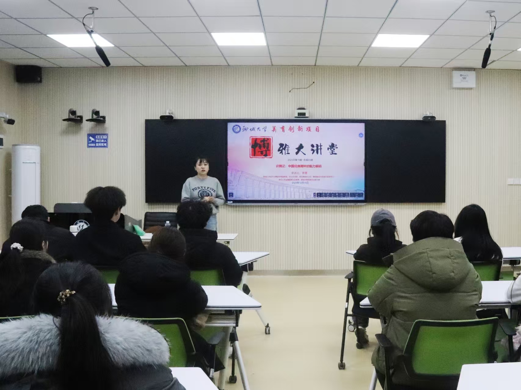 为深化同学们对中国经典舞种艺术特质与文化内核的理解,提升他们的艺术鉴赏水平与人文素养,厚植文化自信,12月11日,由校团委主办,我院承办的博雅大讲堂于6#A401教室举办。本期讲座以“识舞记:中国经典舞种的魅力解码”为主题,特邀李雯担任主讲人。 李雯以舞蹈分类为基础,聚焦汉族、傣族、蒙古族、维吾尔族、藏族五大舞种,从视觉呈现、动作范式、气质风格三大方面,系统拆解中国经典舞种的“魅力密码”。为使抽象的艺术内涵与文化特质更直观可感,她结合经典舞蹈视频片段,逐一解析各民族舞种的核心特点。她指出,蒙古族舞蹈以平圆、立圆、八字圆为核心,尽显豪迈奔放气质;傣族舞蹈踢步和摆胯的经典动作,源自民族日常爬坡过溪的生活步态。她还以杨丽萍《雀之灵》为例,现场示范孔雀姿态,帮助同学们直观感受舞蹈灵动韵味;维吾尔族舞蹈以动脖子、摇头扭腰为标志性动作,遵循“歌者不舞,舞者不歌”的独特表演形式;藏族舞蹈则因高海拔生活环境形成俯身低头体态,颤膝、合手是其核心动作表达。讲解过程中,李雯始终采用视频赏析与动作示范相结合的方式,同步设置互动分享环节,引导同学们交流印象深刻的民族舞蹈及感悟,现场氛围轻松融洽、互动热烈。 本次活动的顺利举办,以创新形式解码经典舞种的文化内涵,不仅有利于同学们领略中国舞蹈的艺术精髓,深化其对少数民族文化的认知,也有利于提升他们的艺术鉴赏能力,进一步激发其对中华传统舞蹈文化的喜爱,强化学院“以文化人、以美育人”的育人理念。(通讯员 张宇涵 刘雪怡 王梦) 专家介绍 李雯,中共党员,聊城大学音乐与舞蹈学院副教授、硕士生导师,现任舞蹈系主任、舞蹈编创与表演党支部书记,兼任山东省舞蹈家协会理事、聊城市舞蹈家协会副主席。从教近二十一年,教学与创作成果丰硕,多次指导学生斩获全国、全省大学生艺术展演、高校师生基本功比赛等重要奖项,获评“优秀指导教师”,作为核心成员参与项目荣获第六届山东省文化创新奖;主持省市级科研及教改项目7项,获教学成果奖3项,发表多篇学术论文、出版专著3部。先后获评山东省新时代“百姓学习之星”、聊城文化英才、聊城大学优秀共产党员等荣誉称号。 (供稿:张宇涵 王梦 刘雪怡 初审:王梦 复审:宋佳珊 终审:尤姗姗)