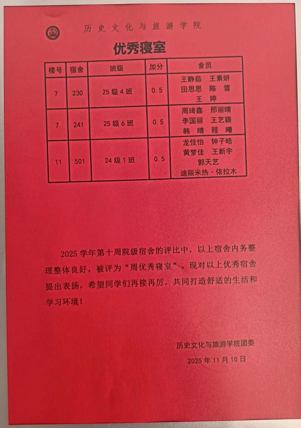 为营造整洁有序、团结友爱的宿舍环境,推进学生社区精神文明建设,第十一周,我院于群星公寓举办“院级宿舍”评比活动。本次活动通过评选优秀宿舍典型,引导同学们以寝风促学风,共同构建温馨和谐的生活环境,展现当代大学生朝气蓬勃的精神风貌。 本次活动的顺利举办,不仅能够引导同学们在宿舍生活中更加自律,培养其健康的生活习惯,还有利于营造温馨和谐的宿舍环境,提升同学们的校园生活幸福感。 (供稿:历史文化与旅游学院 初审:陆雅馨 复审:宋佳珊 终审:尤姗姗)