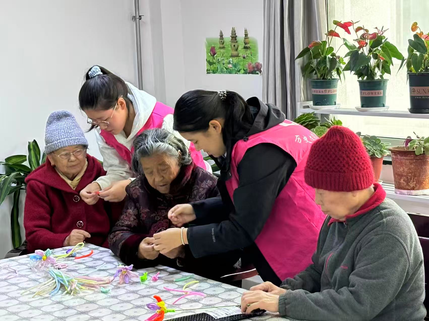 为丰富群众的精神生活,传递社会关怀,弘扬尊老敬老的中华民族传统美德,11月1日,我院于聊城市敬纳养老院举办“巧手焕新趣,银发乐无边”活动。 志愿者精心筹备粗杆扭扭棒、花艺胶带、防滑剪具等安全易操作的创作材料,采用“一对一协助、一对二指导”的分组模式,确保服务精准到位。活动现场,志愿者将材料有序摆放至群众手边,通过成品展示、玩法讲解等方式,引导群众自主选择心仪样式,帮助其初步熟悉活动流程与创作方向。讲解过程中,志愿者与群众积极互动,以慢动作演示“绕圈塑花瓣”“拧绳作花茎”等基础手法,将复杂的创作步骤进行拆解,便于群众理解掌握。 创作过程中,群众热情高涨、认真实践,专注拉伸扭扭棒、塑形花瓣。针对部分群众指尖发力不稳的情况,志愿者俯身辅助操作,并反复示范要领。遇到创意想法时,志愿者与群众共同探讨调整方案。志愿者协助群众将作品摆放至展示区,邀请愿意分享的群众介绍创作思路。活动进入尾声,志愿者为每位群众与作品拍摄单人照、集体合影,现场打印照片并附赠手写祝福卡片作为活动纪念。 本次活动的顺利举办,不仅有助于满足老年群体的精神需求,锻炼其动手与沟通能力,而且有利于消除代际间的疏离感与偏见,建立深厚情感,为营造全社会关爱老年群体的氛围奠定坚实基础。 (供稿:涂安琪 李启凤 王舒仪 罗佩华 摄影:陆雅馨 张诺 初审:罗佩华 复审:宋佳珊 终审:尤姗姗)