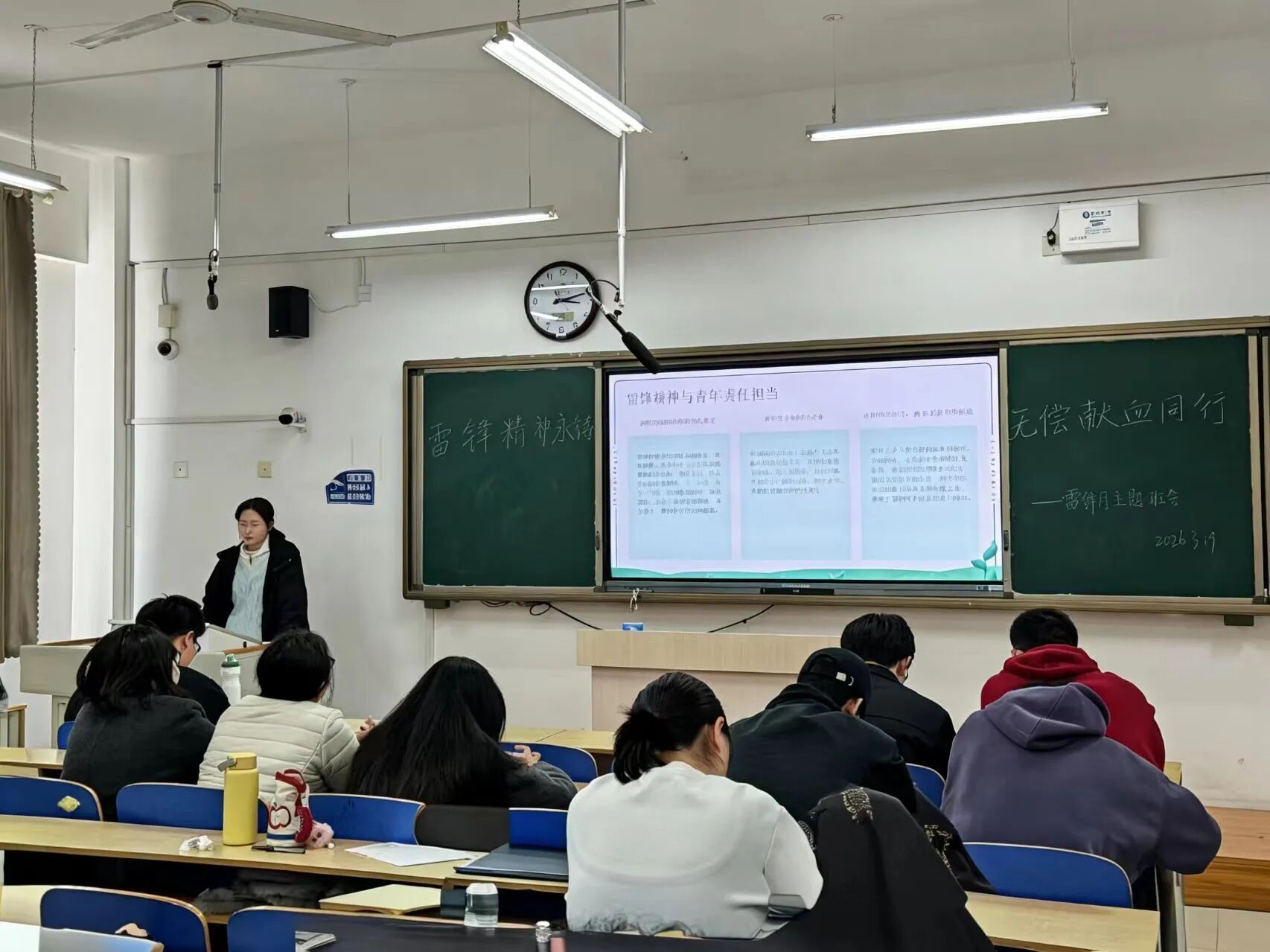 为深入弘扬雷锋精神,践行无私奉献的价值理念,动员青年学子积极参与无偿献血、传递爱心温暖,3月19日,我院于6#A305教室举办“雷锋精神永驻,无偿献血同行”主题班会活动。 主讲人以雷锋的感人事迹为切入点,带领同学们重温雷锋扎根平凡岗位、默默服务他人的感人故事,深刻阐释雷锋精神所蕴含的对党忠诚、服务人民的政治品格,以及融入日常、持之以恒的无私情怀。主讲人结合无偿献血这一具体实践,阐释新时代青年践行雷锋精神的现实路径,阐明无偿献血在临床救治中的重要作用,让同学们充分认识到每一次无偿献血都是对生命最直接的守护与致敬。全体同学共同观看无偿献血公益宣传片,直观感受无偿献血者的善举与奉献,进一步加深他们对“奉献、友爱、互助、进步”志愿精神的理解与认同。 在互动交流环节,同学们主动走上讲台,分享身边的好人好事与自己的志愿服务经历,他们在交流中相互启发、彼此激励,现场氛围庄重而热烈。交流结束后,同学们纷纷表示雷锋精神从未远去,始终贯穿于日常生活的点滴之中,今后自己将积极参与无偿献血等志愿服务,以实际行动践行新时代青年的责任与担当。 本次活动的顺利举办,深化同学们对雷锋精神时代内涵的认知,有利于在班级中营造出崇德向善、互帮互助的浓厚氛围,为培养有担当、有温度的时代新人奠定坚实基础,使青春在奉献中绽放出绚丽光彩。 (供稿:孟妙言 刘雪怡 初审:王梦 复审:魏志鹏 终审:尤姗姗)