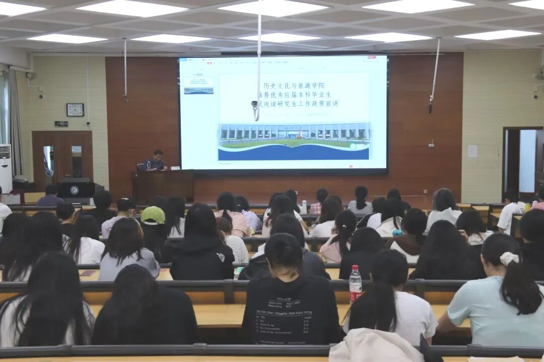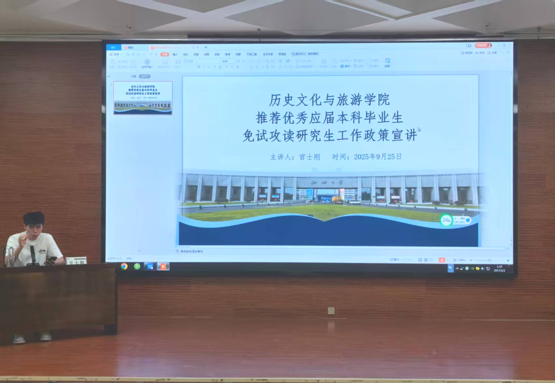 官士刚围绕学院今年推免政策的调整进行重点解读。他表示,学院将进一步优化竞赛加分机制,鼓励学生自主组建团队,以赛促学、以赛强能;并适当提高学生管理工作在评分中的比重,引导学生实现学术能力与服务实践的平衡发展。 针对升学择校,官士刚指出,学生应优先瞄准“双一流”建设高校或学科领域内的优势院校,建议学生提前关注目标院校的暑期夏令营活动,主动通过学术邮件、学术会议等渠道与意向导师建立联系,为后续保研复试积累优势。 优秀毕业生代表结合自身经历,向在场学生分享三点建议:一是尽早结合个人兴趣与专业方向,明确研究领域,有针对性地研读目标院校导师的学术专著,把握研究前沿动态;二是主动参与科研项目,丰富学术经历,提升科研素养;三是培养良好读书习惯,广泛涉猎跨学科书籍,为专业学习打下扎实基础。 本次推免政策专题宣讲会的顺利举办,不仅为学生搭建政策解读与经验交流的优质平台,帮助学生清晰把握推免流程、评分标准等关键信息,而且有效引导学生立足当下制定科学的发展规划,为后续提升人才培养质量、助力更多学生实现升学理想奠定坚实基础。 (供稿:郭艺泽 摄影:郭艺泽 初审:宋佳珊 复审:张程程 终审:尤姗姗)为帮助学生更好了解推免政策,引导其科学规划升学路径,明晰个人发展目标,9月25日,我院于6#106报告厅召开推免政策专题宣讲会。学院副院长官士刚担任本次会议主讲人。