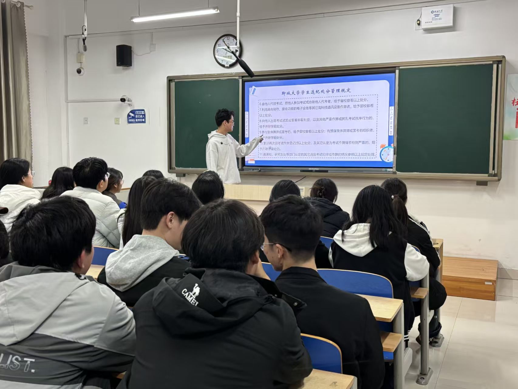 为进一步涵养优良学风校风,强化学生诚信考试意识,营造公平公正的考试环境,筑牢诚信考试防线,近日,我院组织各年级开展考风考纪主题班会。班会由各班班主任主持,全体学生参会。 在考风考纪政策宣讲环节,班主任依托PPT,结合学校考试管理规定,逐条解读违纪作弊的处理办法,直观展示考场禁忌行为,明确作弊的处分后果。班主任强调学术诚信对文旅行业人才培养的重要意义,引导学生树立正确的价值观,使学生认识到遵守考场纪律的必要性。在案例警示讲解环节,班主任通过典型案例分享和作弊后果的现身说法,向学生展示违纪作弊对个人学业和职业生涯的负面影响。 学生结合自身备考经历,分享心得体会,进一步深化对考风考纪的认识。在行为准则学习阶段,班主任带领全体学生集中学习《聊城大学学生考试守则》和《聊城大学学生违纪处分管理规定》,明确具体实施办法和规范标准。学生在聆听的同时认真记录,针对“特殊情况缺考如何申请”“考试物品携带规范”等疑问现场提问。班主任逐一耐心解答,确保每位学生都能清晰掌握考试规则与纪律要求。 本次活动的顺利举办,不仅帮助学生明确考试纪律的“红线”与“底线”,有效强化学生的规则意识和诚信自觉,而且能够推动优良考风融入日常学习生活,为营造公平公正的育人环境、培养高素质文旅人才提供坚实保障。 (供稿:胡书宾 罗佩华 初审:罗佩华 复审:宋佳珊 终审:尤姗姗)