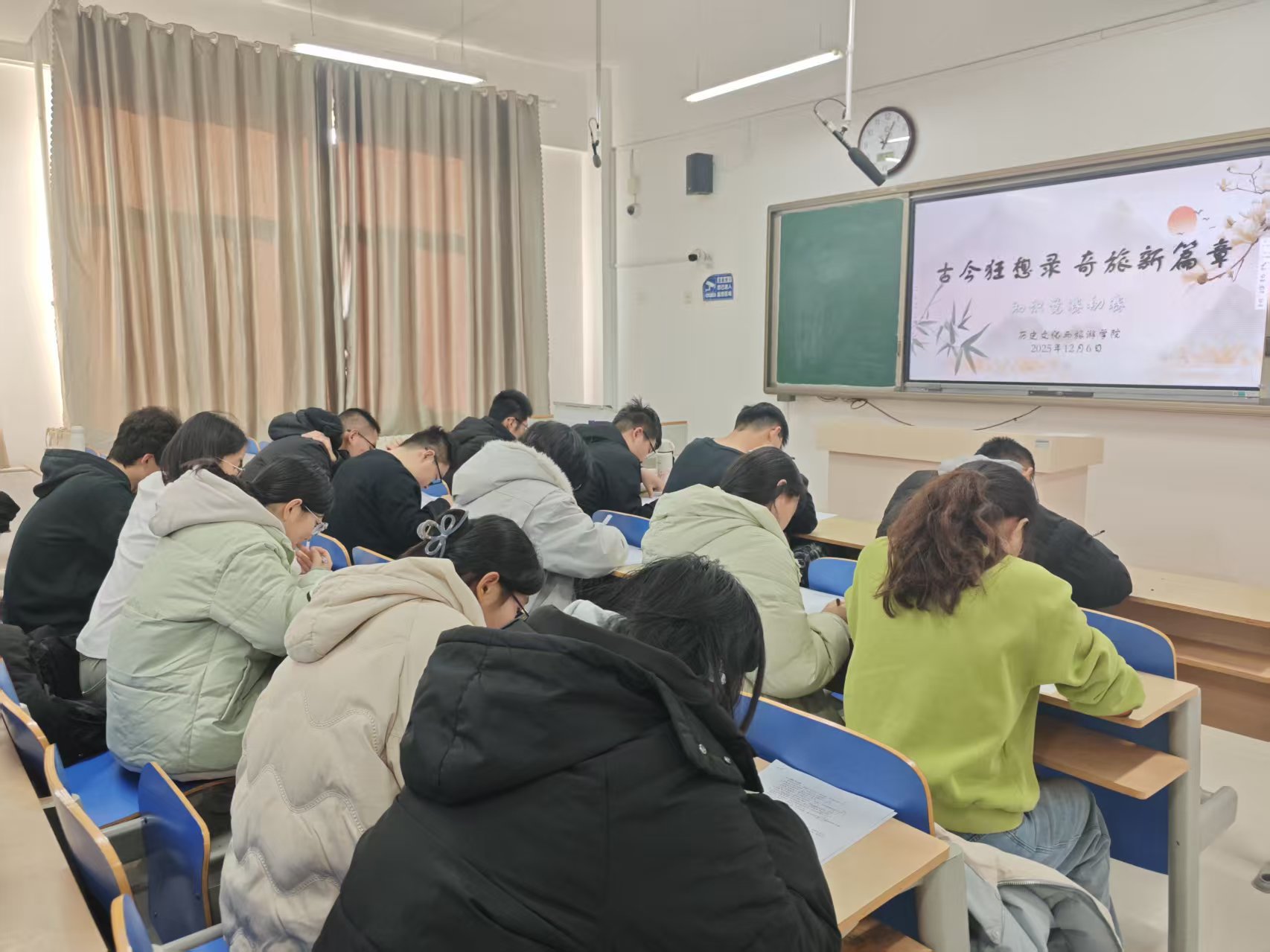 为引导同学们深入了解中华文明的发展脉络,在感悟山河壮美与人文底蕴中提升综合素养、厚植家国情怀,12月6日,我院于6#A304教室举办“古今狂想录,奇旅新篇章”知识竞赛初赛。 本次初赛以“沉浸式答题竞技”为核心,设立单选题、多选题与判断题三个环节。试题内容涵盖中华文明发展史、山河文旅资源、非物质文化遗产传承等多个维度,兼顾知识性、趣味性与实践性,全面考察同学们的文化素养与知识储备。工作人员首先对比赛规则、评审标准及注意事项进行详尽说明,并统一发放试题。竞赛现场,同学们全神贯注、沉稳应答,展现出扎实的知识功底与敏捷的思维。整场比赛节奏紧凑、秩序井然,氛围紧张而热烈。 答题结束后,工作人员依据公平、公正、公开的原则,严谨细致地完成试卷的批阅与成绩复核工作。通过综合评定,李心悦等13名同学成功晋级决赛,他们纷纷表示,将以更加饱满的热情和充分的准备投入到决赛的备战中,争取再创佳绩。 本次活动的顺利举办,不仅有效激发了同学们对历史文化的探究热情,切实锤炼了其逻辑思辨与应急应变能力,更进一步厚植了勤学善思、笃行探知的校园文化氛围,为引导青年学子关注文化遗产、传承历史文脉、厚植文化自信注入了蓬勃的青春力量。 (供稿:刘治坤 高越 初审:罗佩华 复审:宋佳珊 终审:尤姗姗)