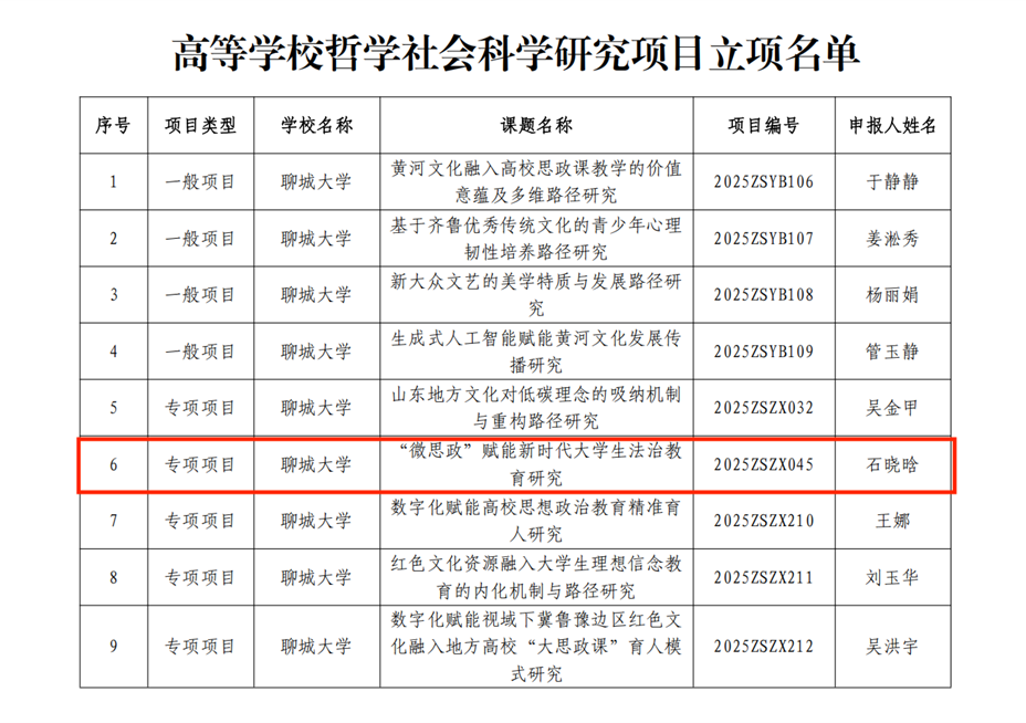 我院教师获山东省高等学校哲学社会科学研究项目立项 近日,山东省教育厅公布了2025年度山东省高等学校哲学社会科学研究项目立项名单,我院教师石晓晗喜获立项。 近年来,历史文化与旅游学院高度重视哲学社会科学工作,以高质量发展为引领,以培育高水平成果为核心目标。下一步,我院将以此为契机,充分发挥优秀成果的引领示范作用,助力我院科研工作再上新台阶。 臧雯睿