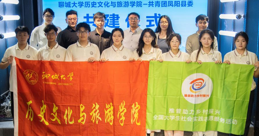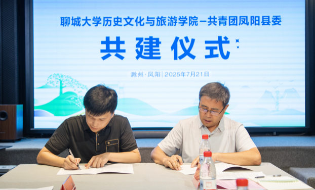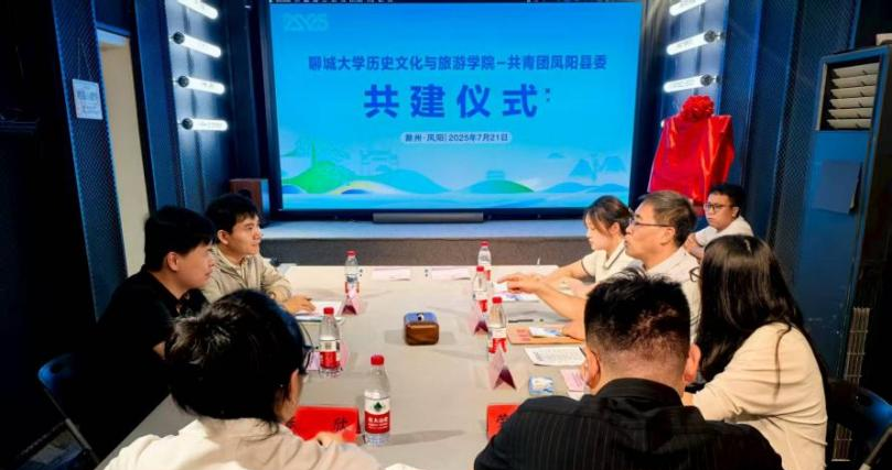 为深化校地协同育人机制,赋能青年学子成长成才,推动非遗文化传承创新与地方文旅事业繁荣发展,7 月 21 日,聊城大学历史文化与旅游学院与共青团凤阳县委在明影文化传媒有限公司隆重举行校地共建协议签约仪式,共同为“聊城大学大学生社会实践基地”揭牌。共青团凤阳县委副书记金帅,聊城大学历史文化与旅游学院党委副书记、副院长卢庆洪,辅导员薛晓宇出席仪式,见证校地合作开启崭新篇章。 在观看了凤阳城市推介片《凤采飞扬》和聊城大学历史文化与旅游学院宣传片后,金帅代表共青团凤阳县委对聊大师生一行表示热烈欢迎。他强调,共建社会实践基地是凝聚青年力量、服务区域发展大局的重要战略支点,希望双方以活化地域文化基因、升级志愿服务能级为关键抓手,将聊大的学科优势深度融入凤阳“人才强县”战略,让高校智慧与地方发展同频共振,实现互利共赢的良好局面。 卢庆洪回顾学院“经世致用”的实践育人传统,高度评价此次共建的里程碑意义。卢庆洪表示,学院将以实践基地为纽带,充分发挥历史文化研究、旅游管理规划等专业优势,深化资源共享与优势互补,推动育人链与需求链精准对接,引导学生在火热的社会课堂中“受教育、长才干、作贡献”,助力地方在深度合作中激发内生动力、提升发展质效,最终实现“高校智慧赋能地方振兴,地方沃土反哺育人成才”的良性循环与共生共荣。 凤阳县青年志愿者协会负责人荣超凡与我院学生代表王柯懿分别作交流发言,围绕校地志愿服务品牌打造、非遗文化研学实践等后续合作方向分享思路与愿景,为共建项目的落地见效注入青春思考。 仪式最后,双方代表共同签署“校地共建”协议,共同为“聊城大学大学生社会实践基地”揭牌,为校地协同育人与地方文化振兴搭建起坚实桥梁。 此次共建仪式的举行,既是聊城大学扎根中国大地办学、拓展实践育人疆域的主动担当,也是共青团凤阳县委创新发展机制、借力高校资源赋能地方建设的生动实践。未来,双方将以文化传承创新为核心纽带,以志愿服务提质为重要路径,以人才协同培养为坚实基础,持续深化合作内涵,携手谱写校地心手相牵、共促发展的崭新华章。