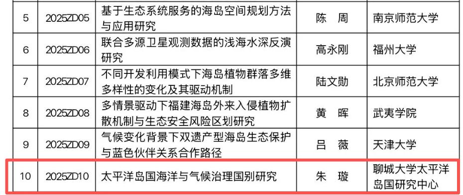 近日,福建省海岛资源生态监测与保护利用重点实验室公布2025年度开放基金立项名单,我校太平洋岛国研究中心朱璇副教授申报的“太平洋岛国海洋与气候治理国别研究”课题成功获批立项。 近年来,中心高度重视科研项目申报工作,大力推进有组织科研活动,着力提升科研项目申报质量与成效。下一步,中心将进一步加大对高水平科研项目的支持力度,推动高质量科研成果产出,为学校高质量发展注入更强科研动力。
