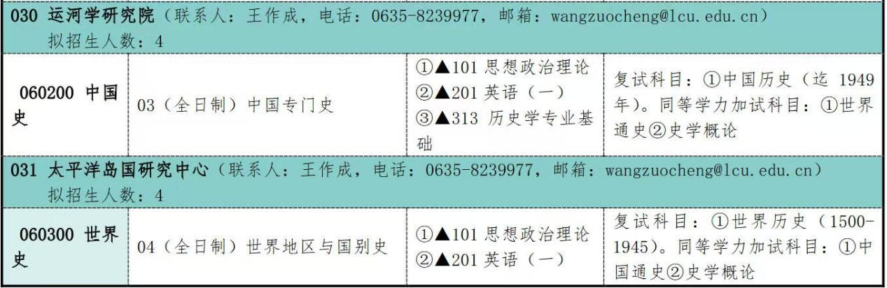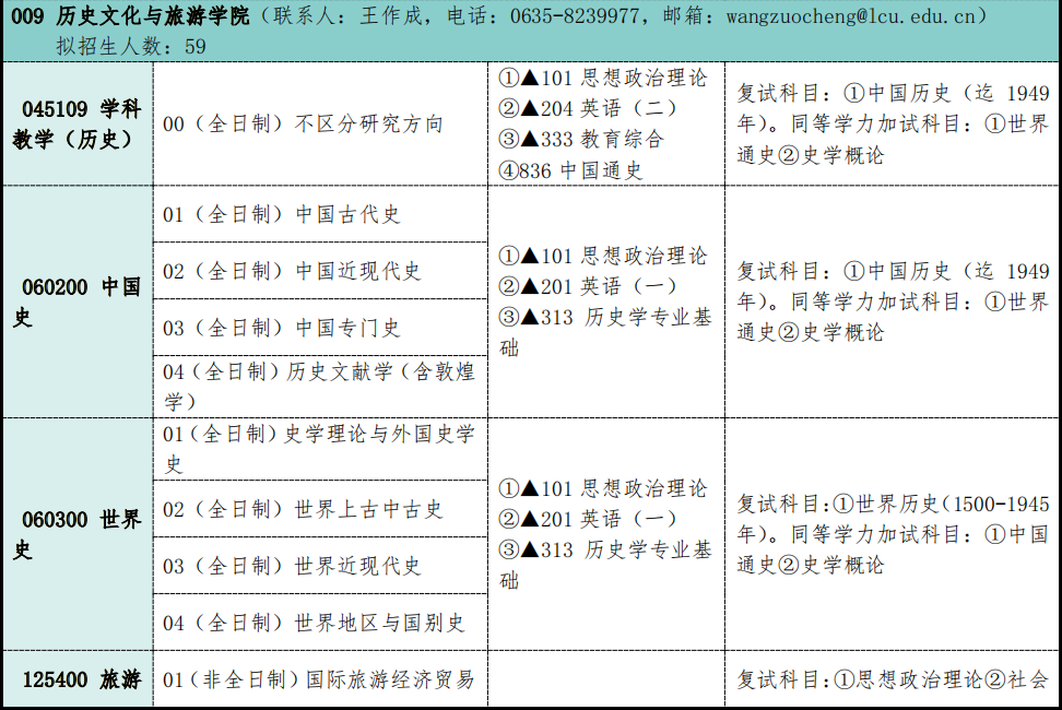 一、招生单位简介 聊城大学历史文化与旅游学院前身为聊城师范学院历史系,始建于1984年,是聊城大学设立较早的院系之一,2002年改建为历史文化学院,2013年更名为历史文化与旅游学院。现有历史学、旅游管理2个本科专业。其中历史学为国家级特色专业、国家级一流本科专业建设点、山东省应用型人才培养特色名校重点建设专业;旅游管理为山东省应用型人才培养特色名校重点建设专业、山东省旅游人才培养基地依托专业。学院拥有世界史、中国史、区域国别学3个一级学科硕士学位授权点,学科教学(历史)和旅游管理(MTA)2个专业学位硕士点。 学院师资力量雄厚,专兼结合、结构合理。现有专任教师65人,其中高级职称30人,占比为46.2%,具有博士学位者54人。教师中多人荣获曾宪梓教师奖、齐鲁文化英才、山东省有突出贡献的中青年专家、山东省高校重点学科首席专家、山东省教学名师、山东省优秀研究生指导教师、山东省智库高端人才、山东省理论人才“百人工程”、山东省智库决策咨询专家、山东省学科新秀、泰山学者青年专家等人才称号。学院高度重视学科建设,持续打造特色鲜明的高水平科研平台。2012年依托世界史学科成立的“聊城大学太平洋岛国研究中心”是国内首个独立建制的研究太平洋岛国的专门机构,也是教育部国别和区域研究中心和山东省首批15家重点新型智库建设单位之一,获评教育部国别和区域研究高水平建设单位。运河学研究院是国内首家以运河及其区域社会为研究对象的机构,拥有山东省社科规划重点研究基地“运河文化研究基地”和山东高校“十二五”人文社科研究基地“运河与区域经济社会发展研究中心”。“中国近现代史”为山东省“十一五”和“十二五”重点学科,“东夷文化研究中心”和“乡村社会转型与治理研究中心”为2个校级科研平台。 二、招生专业目录 三、联系方式 倪老师:0635-8239977